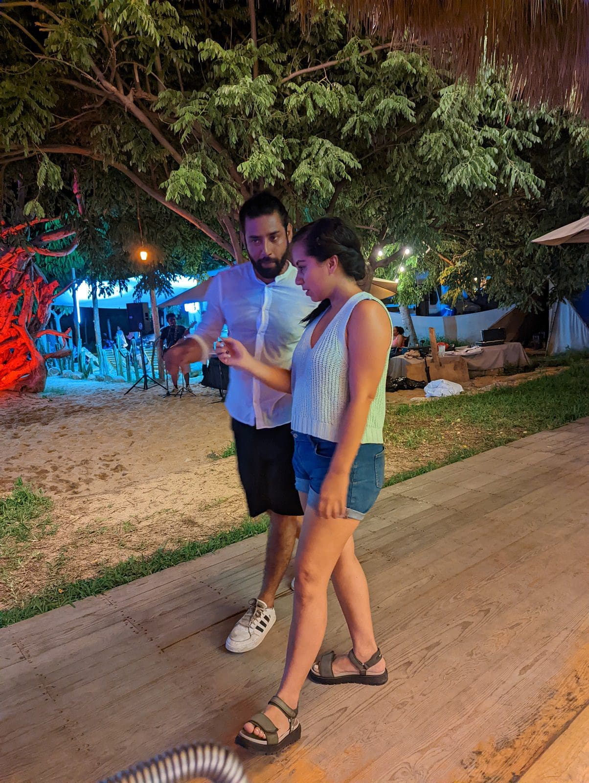 Posteriormente, 8:00pm iniciamos con una clase de baile de ritmos latinos para poder divertirnos. iniciamos con los pasos básicos y después a poner en práctica con la banda de baile en vivo que toca diferentes tipos de ritmos.